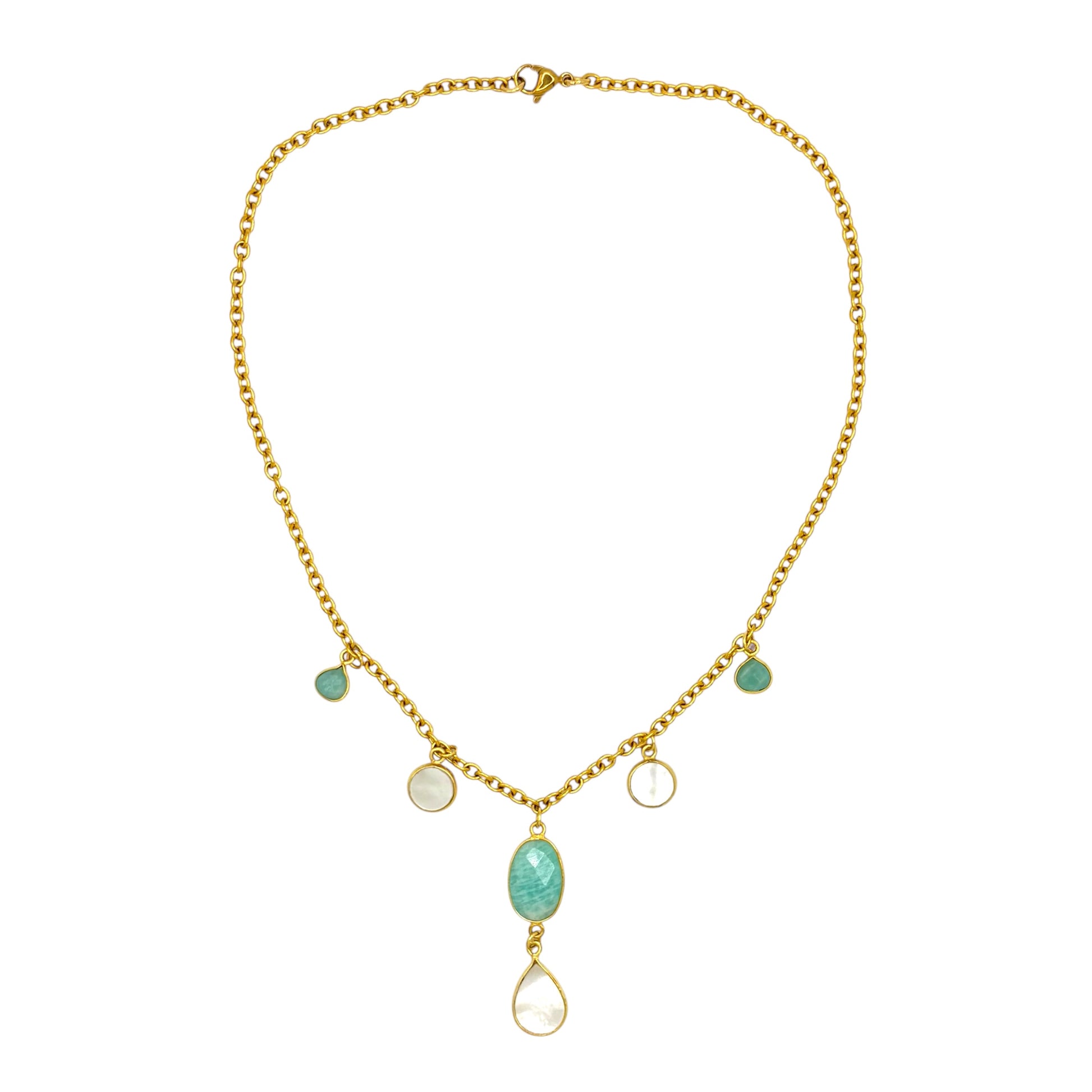 Elegant, handmade charm necklace made with amazonite and pearl.